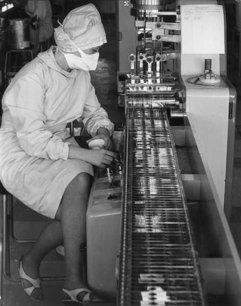 Капсули пеніциліну перевіряються після того, як вони сходять з виробничої лінії в дослідницьких лабораторіях Бічем, Вортінг, Сассекс.
