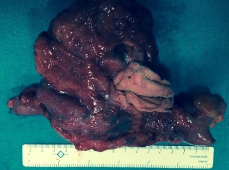 Симптоми: Пацієнтка народила шляхом екстреного кесаревого розтину в іншій країні, і після операції вона відзначила біль у правій нижній частині живота. Лікарі тоді сказали їй, що це нормальний післяопераційний біль, і не стали досліджувати це питання детальніше. Зрештою, на місці утворення утворилася пухлина, і біль у жінки посилився.