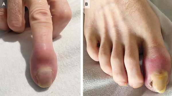 Помітивши набряк пальців руки та ноги, чоловік звернувся до лікарні для обстеження. Лікарі виявили, що кінчик кожного ураженого пальця був червоним і опухлим. Вони також зазначили, що біля нігтя ураженого пальця ноги утворювалася виразка. Лікарі повідомили, що набряклі ділянки були твердими на дотик і чутливими.