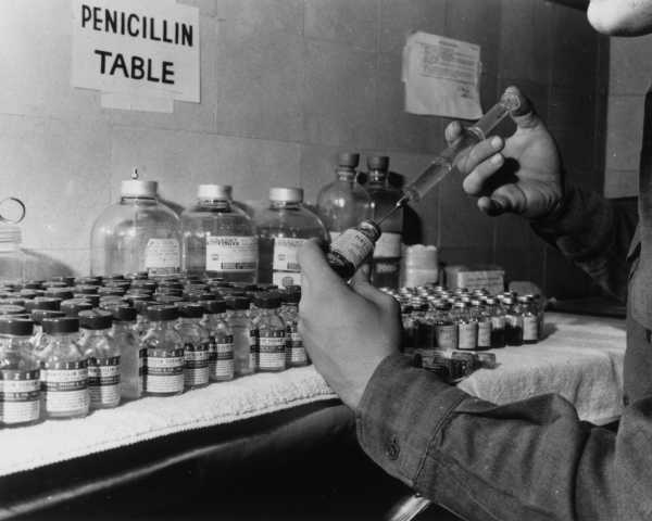 До 1940-х років пеніцилін вироблявся масово. Тут чоловік набирає дозу пеніциліну за допомогою скляного шприца.