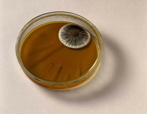Чашка Петрі, що містить бактеріальні колонії, на яких у верхньому правому куті росте цвіль P. notatum. Хімічна речовина, що виробляється грибком, лягла б у основу препарату пеніцилін.