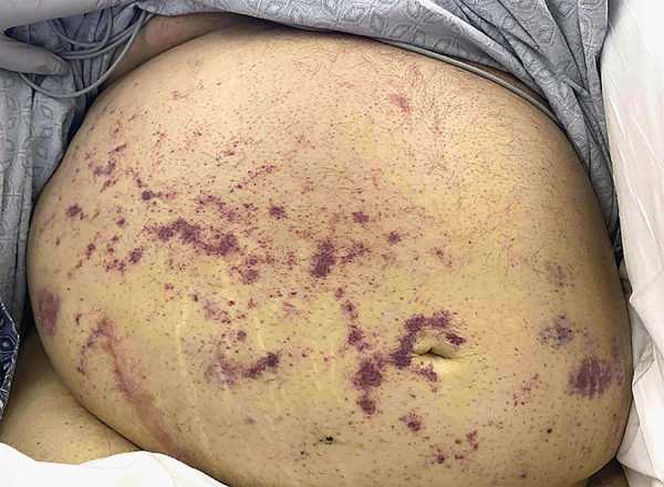 На фотографії, отриманій під час госпіталізації до відділення інтенсивної терапії, видно фіолетовий висип на животі чоловіка.