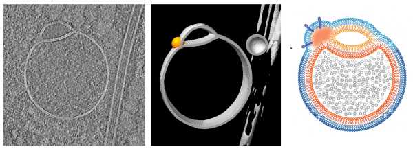 Це зображення кріоелектронної томографії (ліворуч) та дві відповідні схеми (у центрі та праворуч) підкреслюють особливу структуру геміфузоми, де дві мембрани везикул з'єднуються через геміфузійну діафрагму.