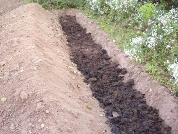 На місці, що звільнилося від посадок, потрібно викопати траншею на ширину майбутньої грядки (60-80 см) глибиною приблизно на півтора багнета лопати, акуратно складаючи родючий грунт поруч. На дно поміщається гній або компост (у кого що є), зверху укладаються рослинні рештки, зібрані з городу, восени цього добра навалом. Можна все це посипати золою, пройтися ногами, щоб утоптати пощільніше. І останній верхній шар – родючий ґрунт (20-30 см).