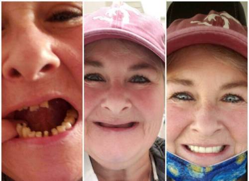 12. «Пацієнтка стоматолога до та після лікування з новим набором зубів»